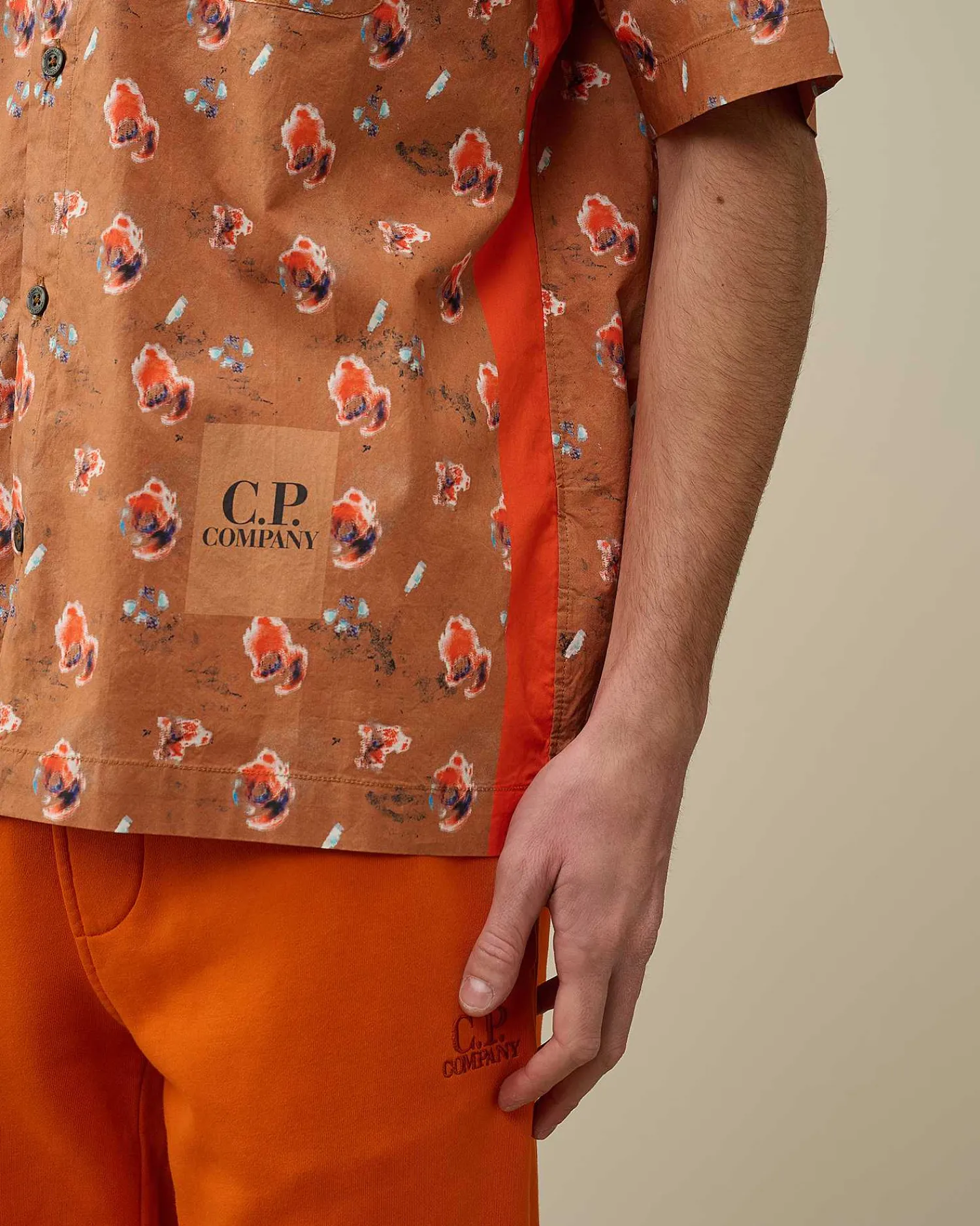Chemise À Manches Courtes Avec Imprimé Sponged Sur L’Ensemble, Col Classique, Fermeture Boutonnée Tout Du Long, Poche Poitrine Ouverte, Logo Imprimé Sur L’Ourlet Du Bas Et Bande Réfléchissante Sur Le Côté. Modèle Confectionné Dans Une Élégante Popeline De Coton Au Toucher Soyeux. Coupe Droite.